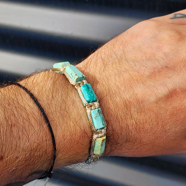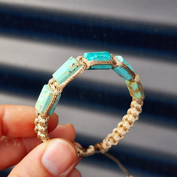 This bracelet has been made with Natural untreated Turquoise stone cylinder beads. It has been made with a square knot macrame weave using waxed tan cord and has been finished with an adjustable sliding knot. Please note, variations will occur in the stones.