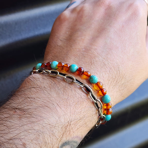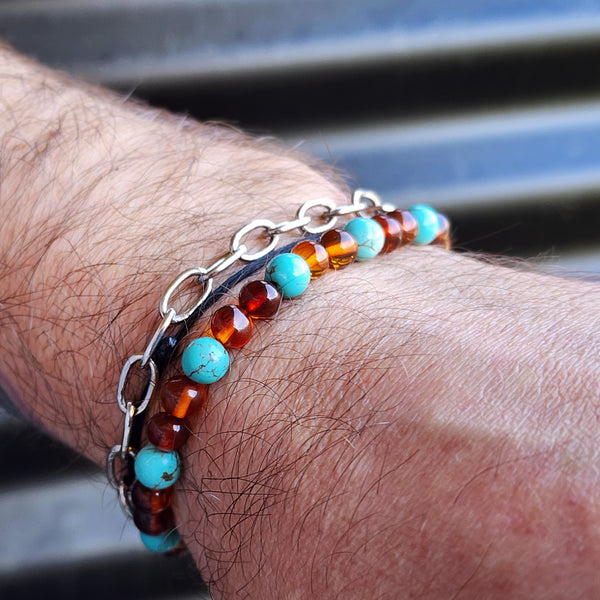 This bracelet has been made with polished Cognac Amber & Turquoise stones (Howlite), strung on stretch elastic.