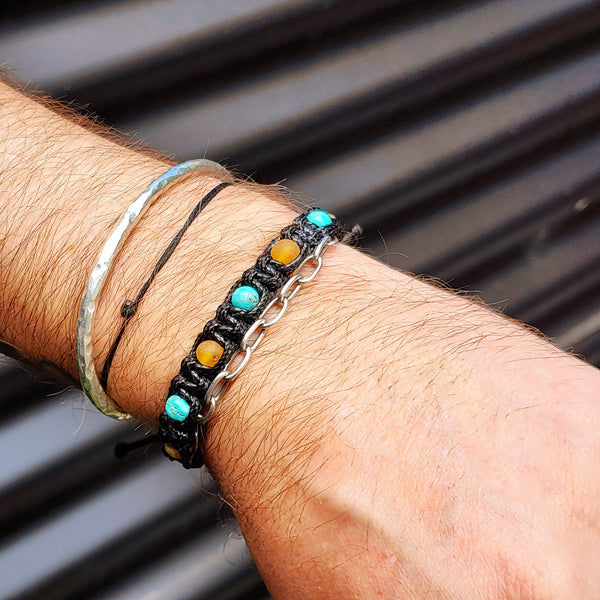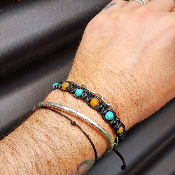 This bracelet has been made with raw Honey Amber.& Turquoise stones (Howlite). It has been made with a square knot macrame weave using waxed black cord and has been finished with an adjustable sliding knot.