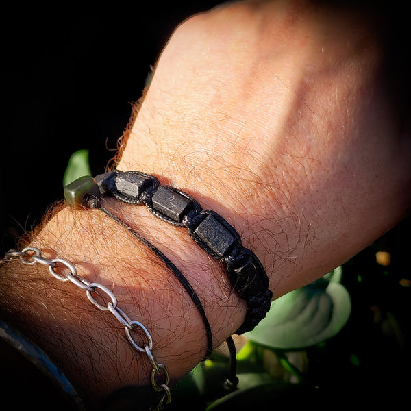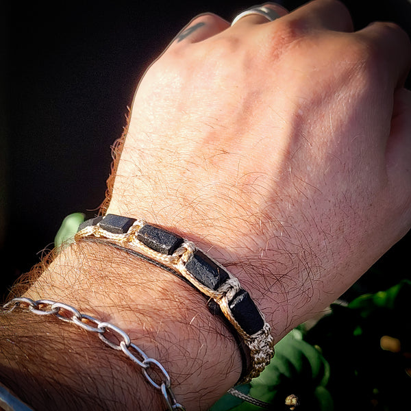 This bracelet has been made with Natural raw black Tourmaline stone cylinder beads. It has been made with a square knot macrame weave using polished cord. Available in black or tan