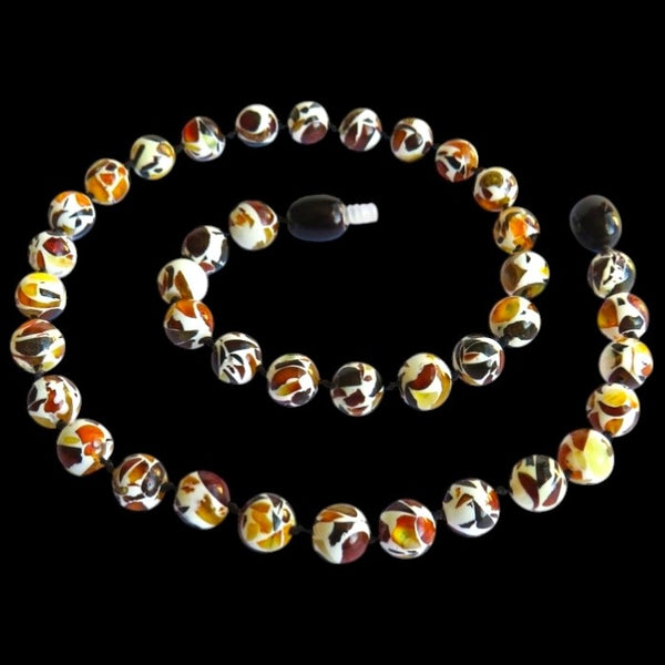 Description: Genuine Amber teething necklace - double knotted between each bead and finished with a screw clasp.