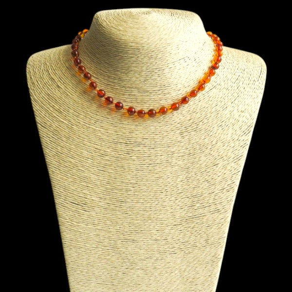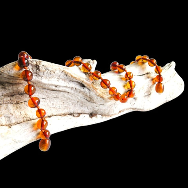 Description: Genuine Amber teething necklace - double knotted between each bead and finished with a screw clasp.