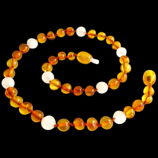 Amber Teething Necklace - Polished Honey & White Quartz