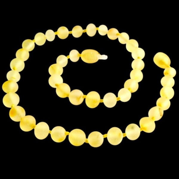 Description: Genuine Amber teething necklace - double knotted between each bead and finished with a screw clasp.