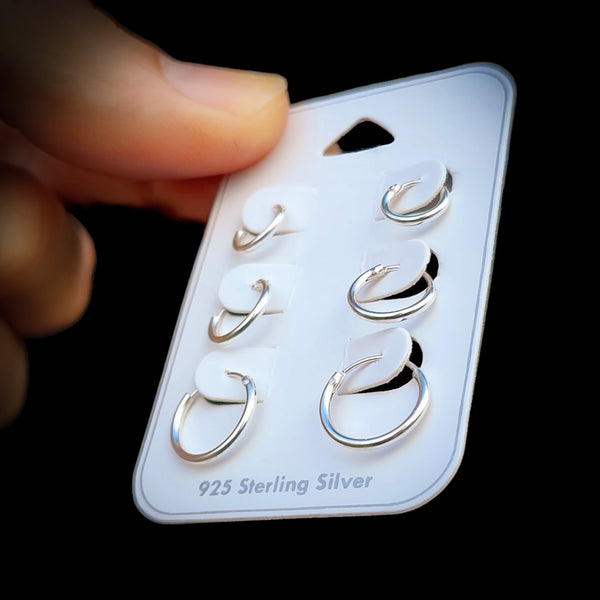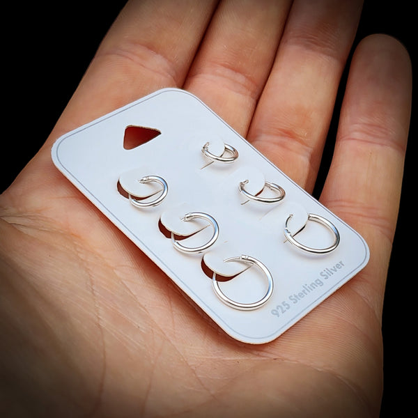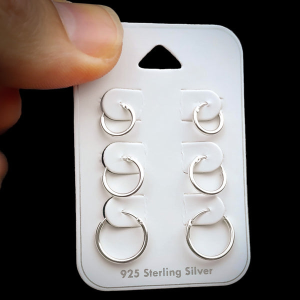 3x Sets of Solid 925 Sterling Silver Round Sleeper Hoop Earrings