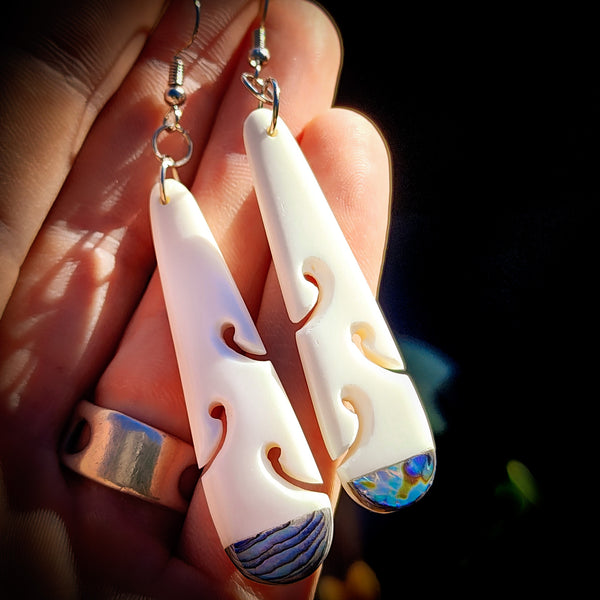 Description: Stunning natural Maori bone carving earrings, Hook long drops with Paua inlays