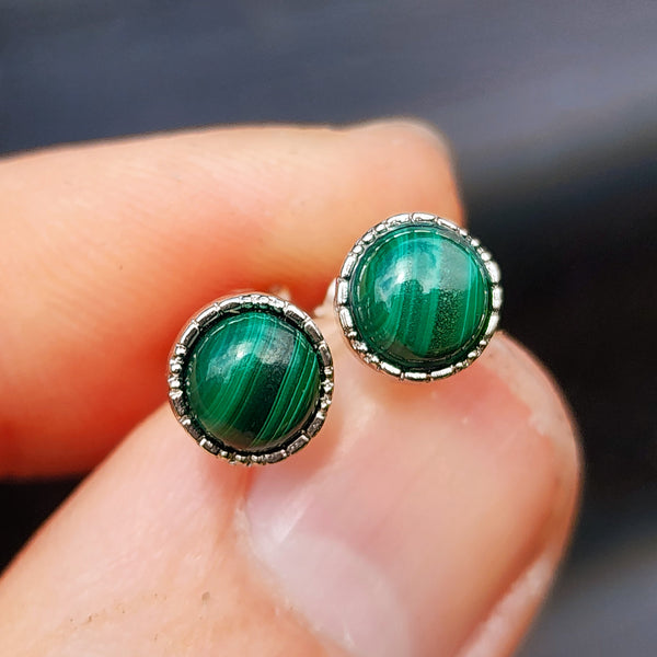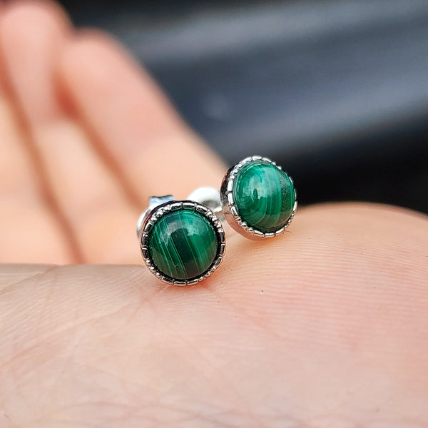 Solid 925 Sterling Silver & 7mm Natural Malachite Round Stud Earrings