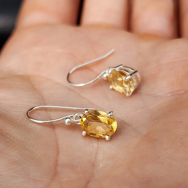 Solid 925 Sterling Silver Clawed Citrine Stone Hook Earrings