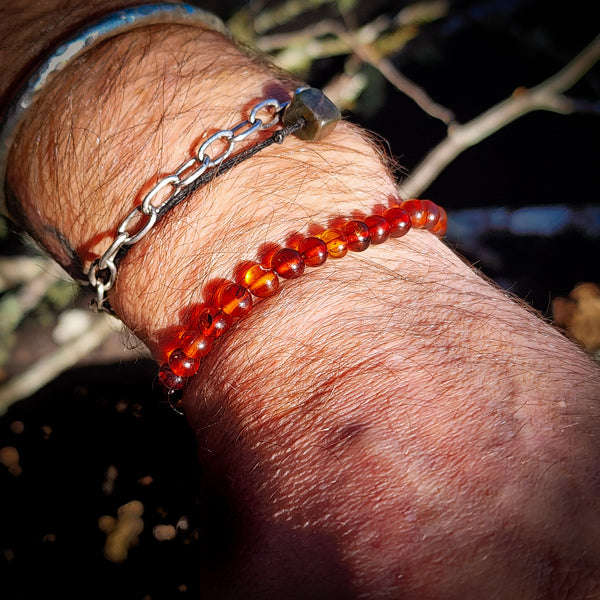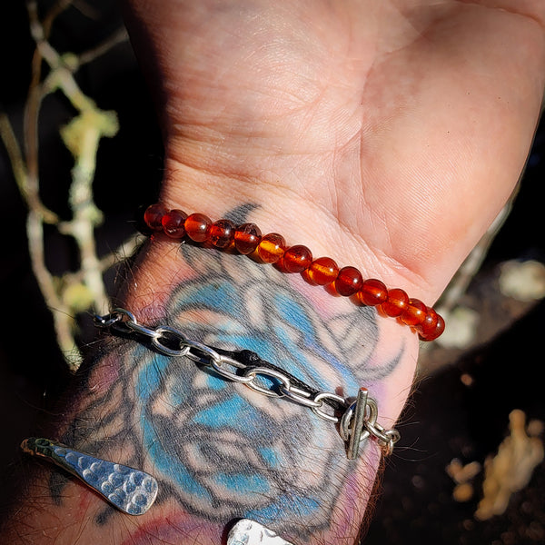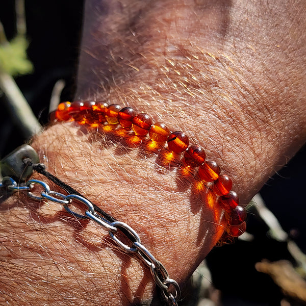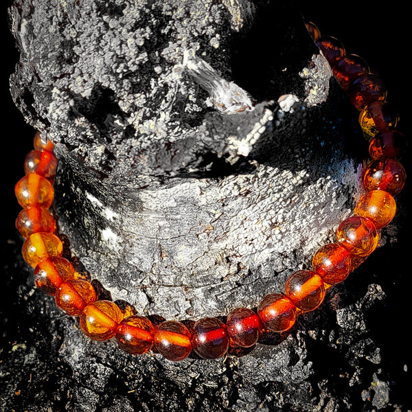 This bracelet has been made with polished Cognac Amber, strung on stretch elastic