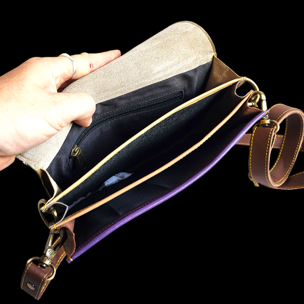 Description: Natural REAL leather & cow hair handbag, 3x pockets + inside Zip pocket