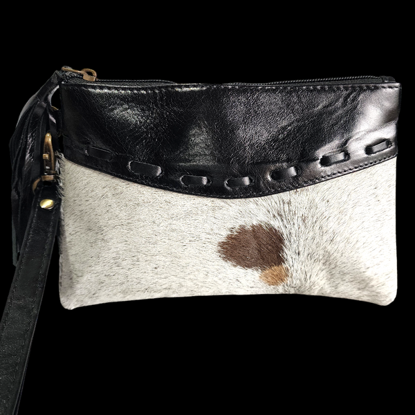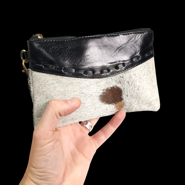 Description: REAL leather & cow hair clutch purse with main zip pocket, inside zip pocket & inside card holder