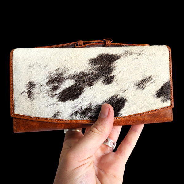 Description: REAL leather & cow hair clutch purse with multiple compartments, zip pockets & card holders