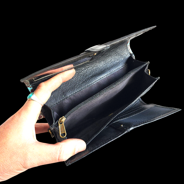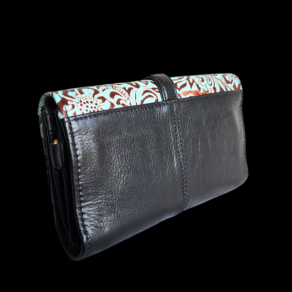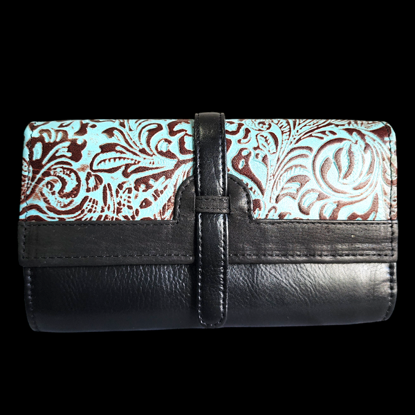Genuine Leather Hand Tooled Purse - Black & Turquoise