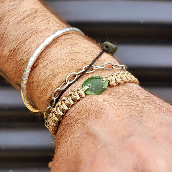 This bracelet has been made with natural Greenstone. It has been made with a square knot macrame weave using waxed cord and has been finished with an adjustable sliding knot.