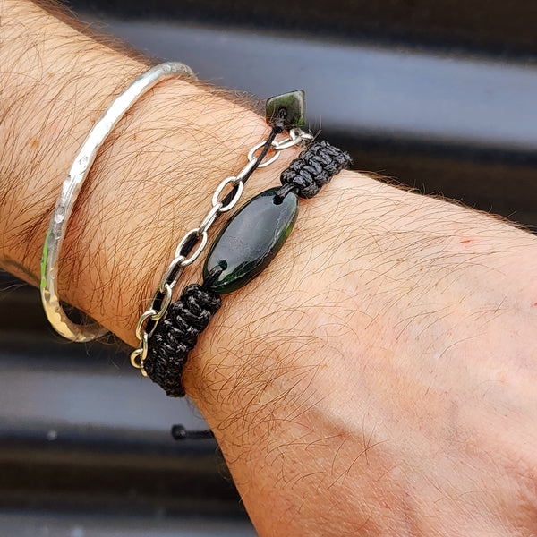 This bracelet has been made with natural Greenstone. It has been made with a square knot macrame weave using waxed cord and has been finished with an adjustable sliding knot.