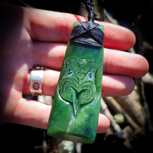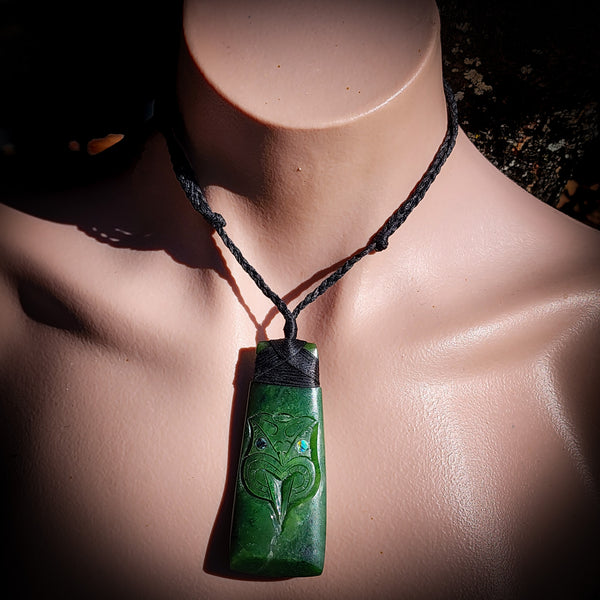 Description: Natural NZ Greenstone / Pounamu carved Toki pendant necklace with etched Taniwha & Paua Eyes