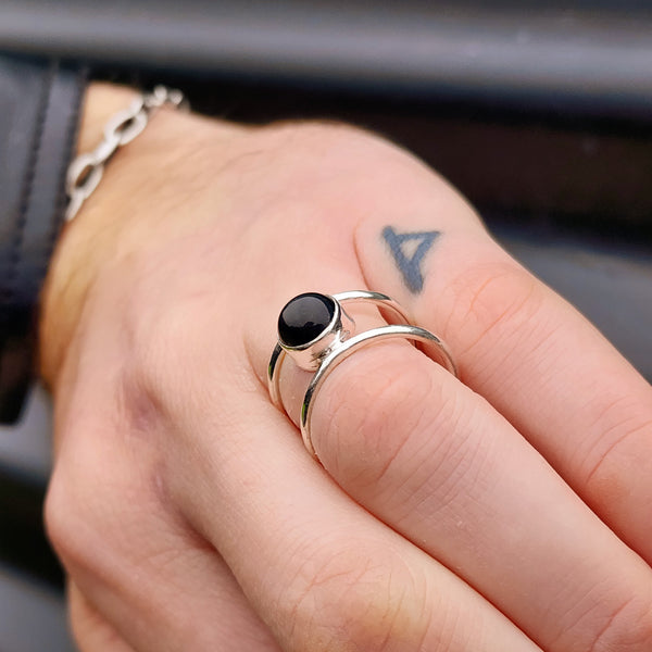 Rustic Handmade Solid 925 Sterling Silver & Natural Black Onyx Double Band Ring