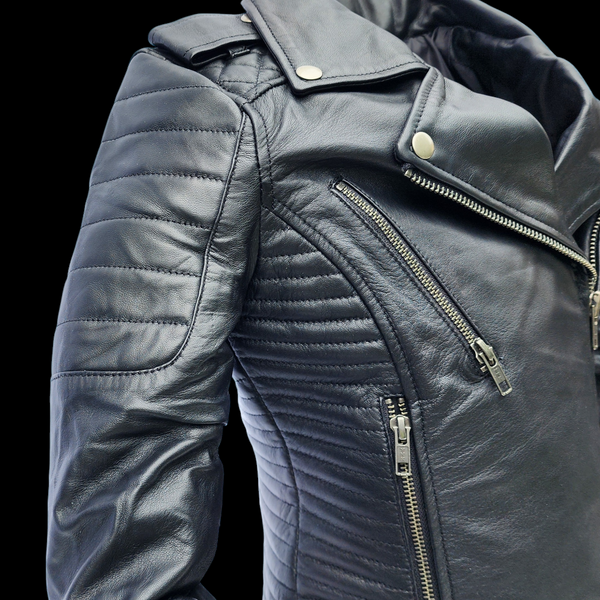 Description: Womens leather jacket made with REAL lambskin leather - Black, side zip, ribbed & quilted