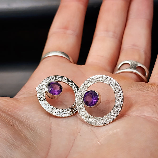 22mm Round Sterling Silver & Natural Amethyst Textured Stud Earrings