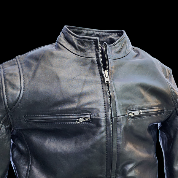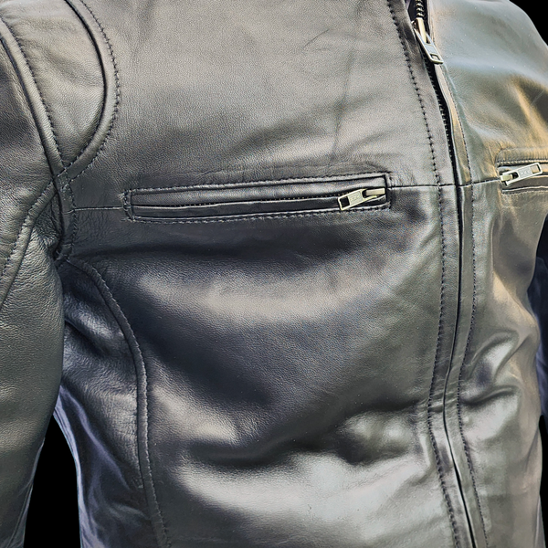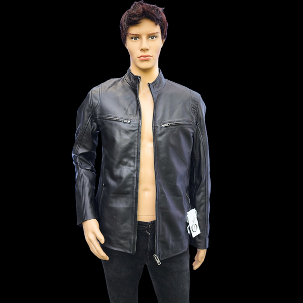 Description: Mens leather jacket made with REAL lambskin leather - black in a classic style cut