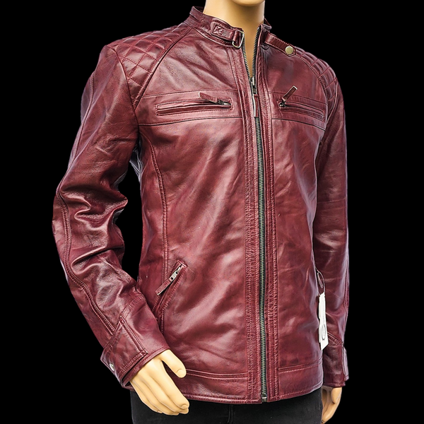 Description: Mens leather jacket made with REAL lambskin leather - burgundy with quilted shoulders.