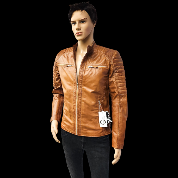 Description: Mens leather jacket made with REAL lambskin leather - tan with ribbed arms / shoulders and lower back