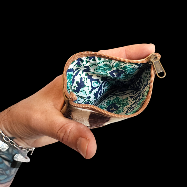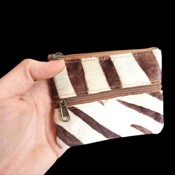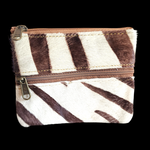 Genuine Leather & Cow Hair Double Zip Coin Purse - Brown / White