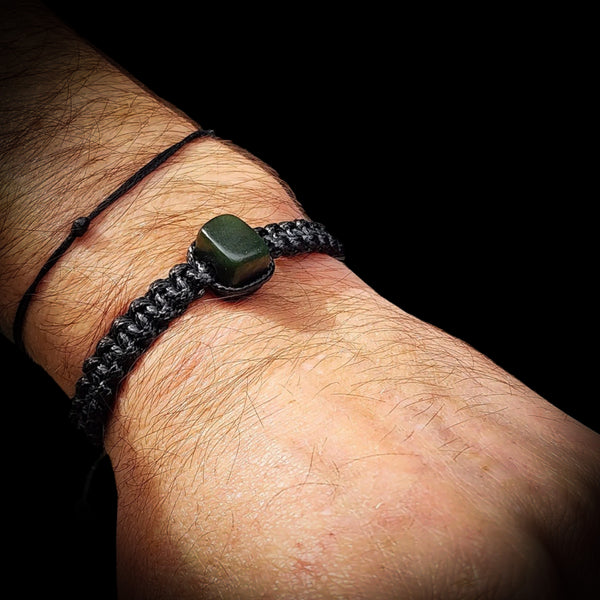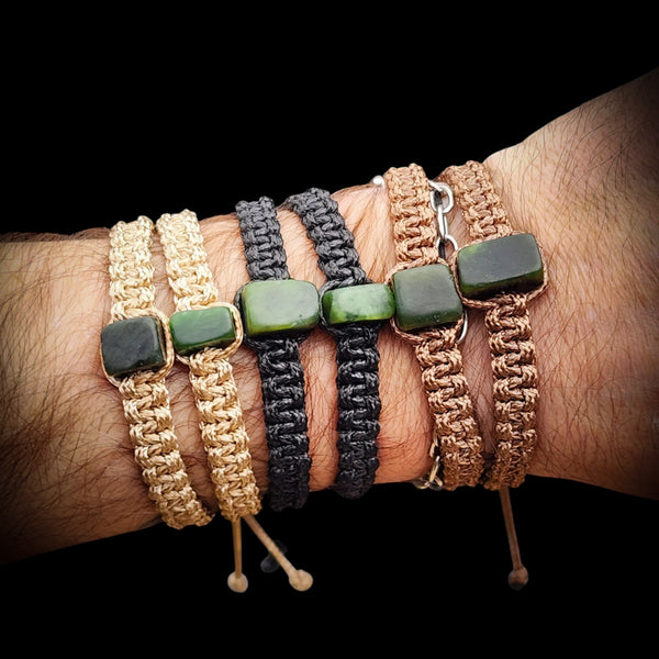 This bracelet has been made with New Zealand Greenstone. It has been made with a square knot macrame weave using cord with adjustable sliding knots. Available in black, tan, or brown.