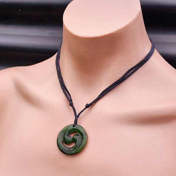 Description: Natural Nephrite Greenstone carved double koru necklace strung on black cord with adjustable sliding knots