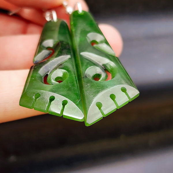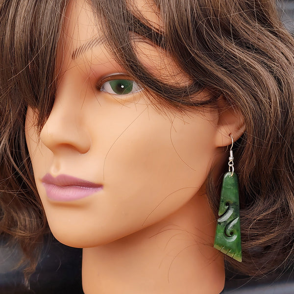 Description: Natural Nephrite Greenstone carved koru angled drop earrings