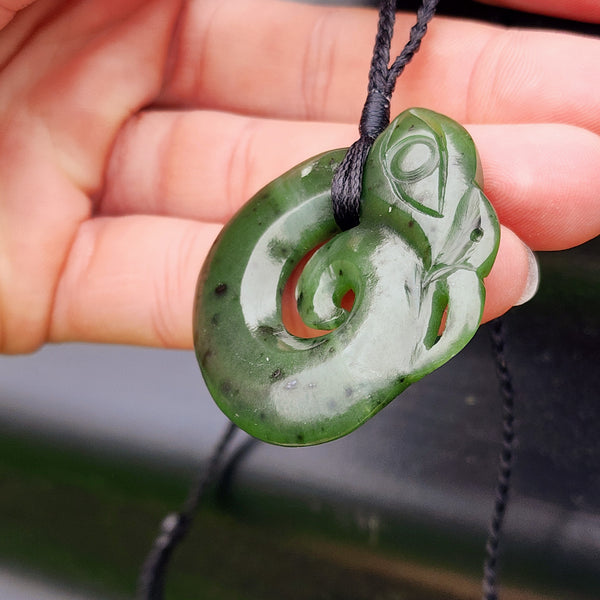 Description: Natural Nephrite Greenstone Manaia Koru pendant necklace strung on black cord with adjustable sliding knots