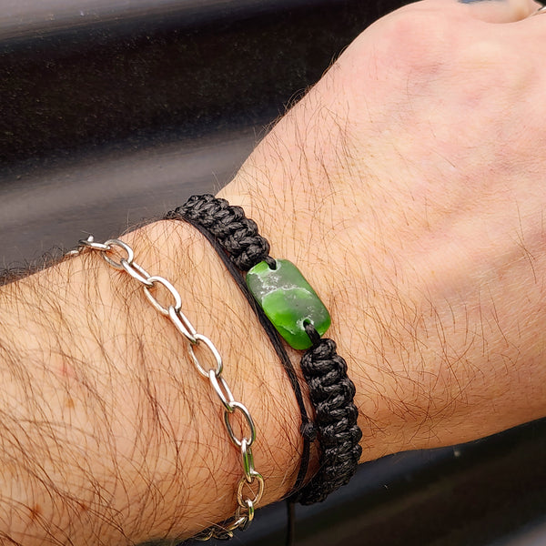 This bracelet has been made with natural Greenstone. It has been made with a square knot macrame weave using waxed cord and has been finished with an adjustable sliding knot.