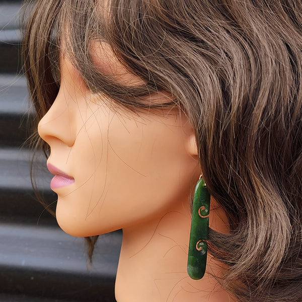 Description: Natural Nephrite Greenstone carved koru rounded drop earrings