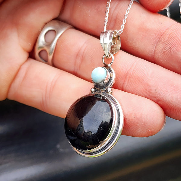 Description: Genuine solid 925 Sterling silver & natural Onyx with larimar round double stone handmade rustic pendant necklace with Italian silver chain