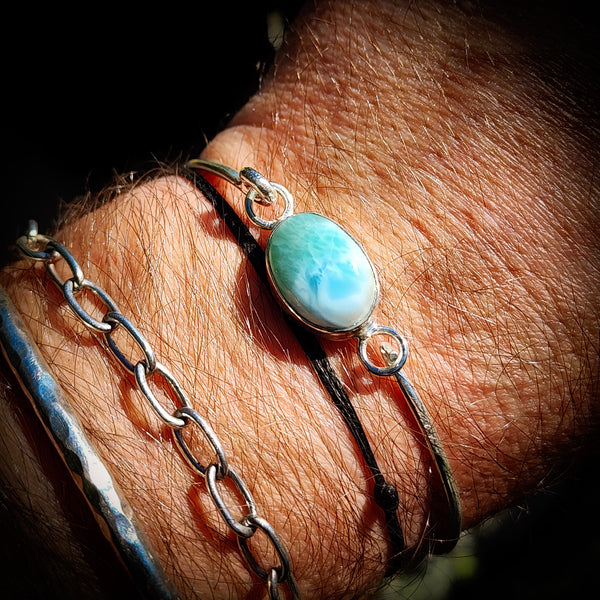 Solid Sterling Silver & Natural Larimar Rustic Handmade Bangle Bracelet (4A10A2)