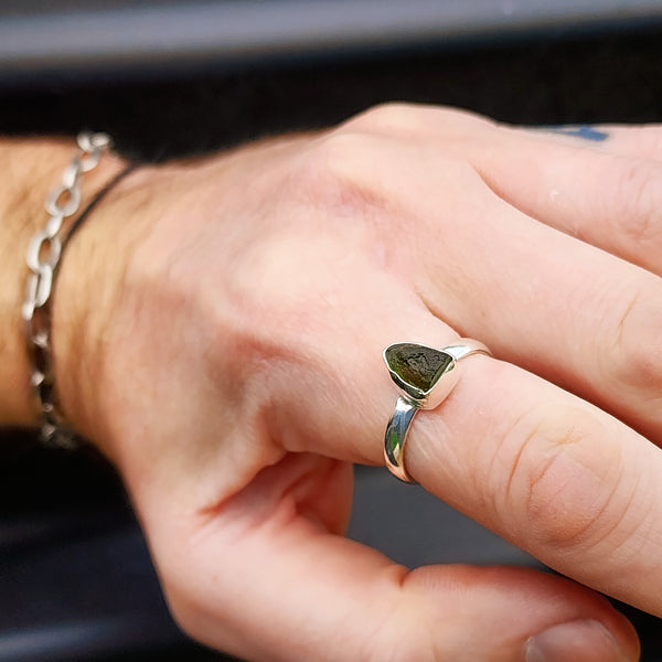 Description: Genuine solid 925 sterling silver & natural Moldavite handmade irregular shaped ring