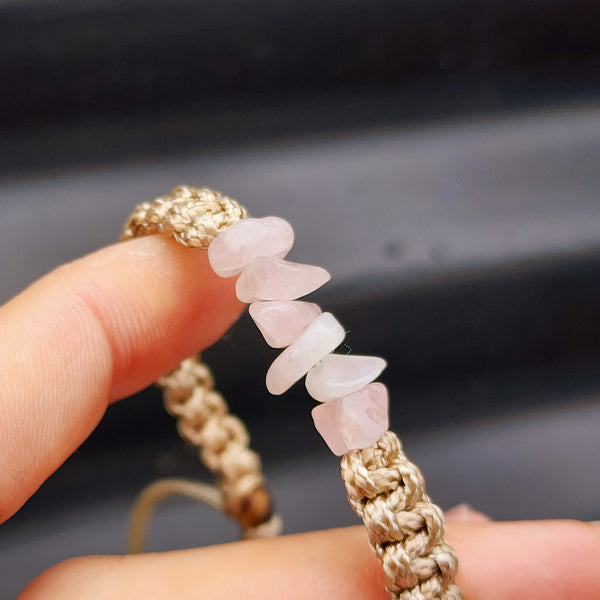 Natural Rose Quartz Chip Tan Macrame Bracelet