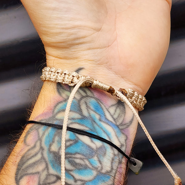 This bracelet has been made with genuine Rose Quartz chips, it has been made with a square knot macrame weave using waxed tan cord and has been finished with an adjustable sliding knot.